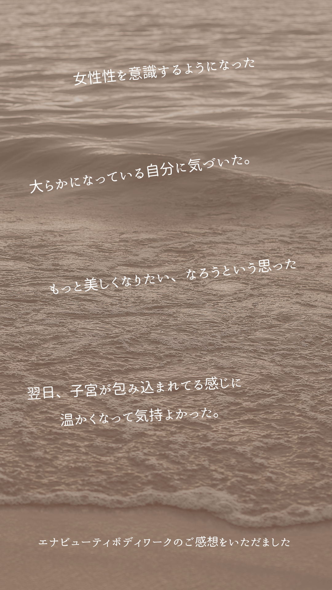 「凪のような安定した感じが心地よかった」 「女性性を意識するようになった」 「おおらかになっている自分に気づいた」 「もっと美しくなりたい、なろうと思った」 「翌日、子宮が包まれている感じになって温かく気持ちよかった」 「満たされている感覚と、目に輝きや艶が出た」 「胸がマシュマロみたいになった」 「人が寄ってくる感じがする。自分のオーラがピンクになった気がする」 「毎日している瞑想が変化して、柔らかくマシュマロのような感覚がある」 「自分の中心に意識が向いて、大切にしようという気持ちになった。少し前向きになって夜に来る絶望的な気持ちがかなり減った。」 「施術後から体の内側、お腹の辺りが温かい感じがした。1週間たってもその感じが続いている。」 「自分のカラダに集中し、他のことをあまり考えずにいれました。」 「自愛のマッサージだと思いました。」 「もっと自分で自分の身体を労ってあげよう!そう感じて、その日から毎日ボディケアに励んでいます☺️」 「頭で考えすぎることなく、ぐっすり眠れるようになった。」 「子どもに対しての気持ちに変化がありました。」