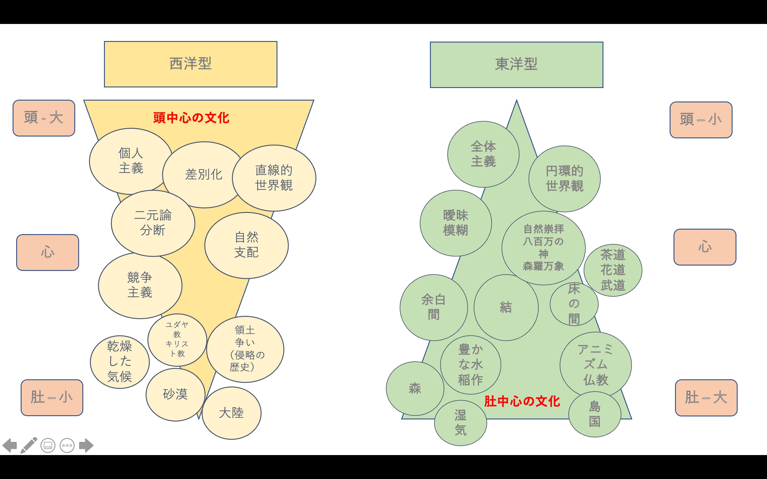 西欧は大陸で砂漠、乾燥し豊かな土壌がないため、陣地を横に広げていき、奪うということで領土を広げてきた。自然を支配し、人を支配し、自分たちが良ければ良いという個人主義が高まっていき、競争が激化し、戦争や差別に至る。宗教は一神教。直線的な世界観が広がっている。